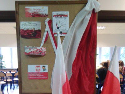 W dniach 9 i 10 listopada w naszej szkole świętowano Dzień Niepodległości. Z okazji tego święta, zostały wykonane okolicznościowe gazetki, radio emitowało patriotyczne piosenki, na korytarzach pojawiły się plakaty o tematyce niepodległościowej, wszystkim przypinano biało– czerwone kokardki. Aula zmieniła się na dwa dni w sale kinową, w której wyświetlano film: „Po latach niewoli wstaje Polska 1914 – 1918”.