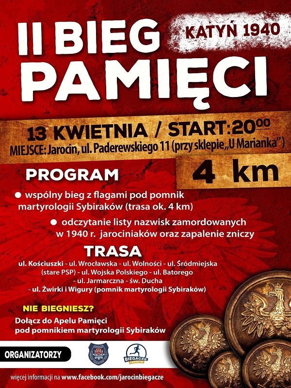 13 kwietnia jest Dniem pamięci Ofiar Zbrodni Katyńskiej. W tym dniu, o godz. 20.00 rozpocznie się II Bieg Pamięci. Bieg, którego celem jest uczczenie pamięci policjantów, żołnierzy, strażaków i wszystkich mieszkańców powiatu jarocińskiego zamordowanych strzałem w tył głowy w 1940 roku.